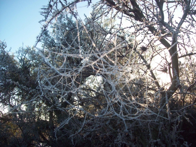 Esto que se ve es una tela de araña congelada, cuando me levante por lamañana descubri que habia acampado en una colonia de arañas! Aunque las telas son grandes las arañas no tanto, menos mal que es invierno...