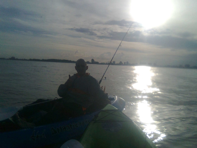 llegamos y el mar estaba con mucho oleaje y medio roto con viento del noreste y muy agradable para entrar ya que no era muy fuerte, para esto cuando yo llegue, ya bogaplatense y latitud1860 estaban en el agua y se mandaban como nazis sin esperar la secuencia de olas y teniendo suerte pasaron la rompiente a los saltos, yo me prepare todo enseguida y me mande atras de ellos que estaban ya fondeados y yo encima sin fondeo porque con el apuro de salir me lo olvide en la plata pero sabia que me podia enganchar en algunos de los chicos asi que no me hice tanto problema, cuando llego a donde estaban los dos el oleaje era vastante pronunciado y divertido o por lo menos para mi que me gusta mucho cuando esta asi, ni bien me acerco javi estaba descompuesto y blanco ya casi pegando la vuelta y todo por no haber tomado un maldito dramamine, asi que mauro que entro atras mio lo acompaño hasta la rompiente para su salida y yo me enganche al kayak de bogaplatense para ponerme a pescar, luego empezaron a entrar todos los demas y a fondearse para pescar y con muy buenos exitos.
