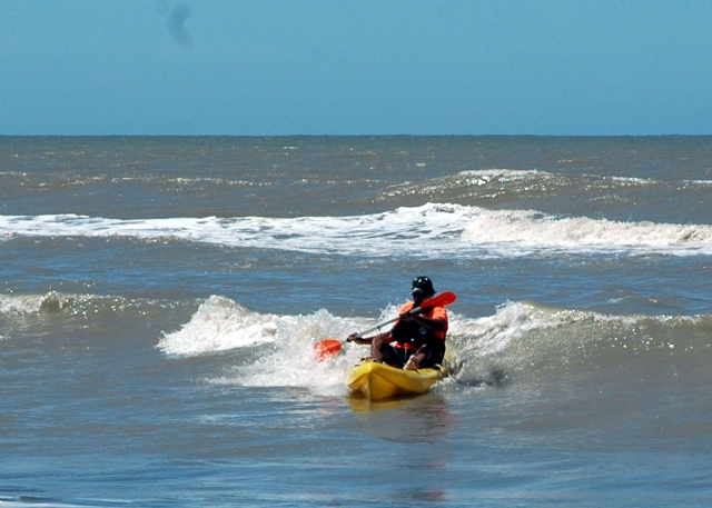 Una vez que se hizo la hora de comer, salimos, yo acompañé a niquito que salió bien de las dos primeras olas y la tercera lo tiró, como ví que hacía pié, me mantuve a una distancia prudencial para no golpearlo con mi kayak pero a la vez poder tenerlo cerca en caso de tener que asistirlo, hasta que llegó el papá a ayudarlo y con el papá llegó una ola que me agarró por detrás mientras miraba el rescate y me revolcó a mi también, que me creía el rey de la salida seca jajaja, ya verán las fotos correspondientes que sacó javi. El único que salió intacto del mar fué Anyulino que salió como un príncipe absolutamente seco, producto de la experiencia adquirida los días anteriores barrenando las olas desde abajo del kayak en reiteradas ocasiones.