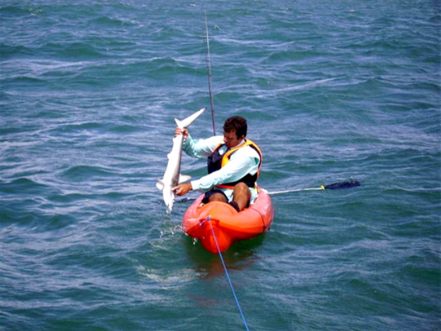 Habia unas olas de la PM, estaba muy dificil para fondear, garreabamos a lo loco y teniamos que remontar 100 metros cada 15 minutos. Entonces, se me ocurrio "una genialidad" (mejor dicho una estupidez) , Diego se ataria a la lancha con 30 metros de cabo, y yo me amarraria al kayak de Diego con un cabo de 5 metros, de esta manera pescariamos en kayak a modo de trencito (perdido por perdido no quedaba otra). Todo marcho bien por media hora, pero el vaiven de las olas tan altas generaban tirones secos que la soga "sin shockord" no absorbian de manera segura, hasta que en una gran ola azul veo que el kayak de Diego se eleva como en una montaña de agua, luego baja y se afloja la soga cruzandose mi kay, la otra ola lo levanto devuleta pegando un tiron que hizo que mi kayak bornee violentamente y zaz!, al agua muñeco.... En ese momento pense en tiburones, en mis equipos, en la camara digital, en que no tenia ropa de recambio, vi la luz y subi. El kayak estaba volteado y los tres equipos en sus cañeros "sin atar", pense que habia perdido todo... Volte el kay rapidamente y las cañas emergieron en sus cañeros como por arte de magia, de pedo no se salieron gracias a que los mangos entraban ajustaditos, persegui durante unos minutos algunas cosas que flotaban y decidi seguir pescando. Demas esta decir que a los 5 minutos temblaba como una hoja y dije "basta para mi", subi a la lancha y termine la jornada con ropa prestada.