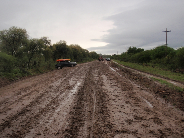 Salimos muy emocionados y con muchas ganas de pescar de Zarate y encaramos para Ceibas, donde nos esperarian unos cuantos km. de tierra, yo conocia bien el camino (o creia conocerlo), cuando llegamos el tema estaba bastante aspero, se ve que habia llovido mucho y estaba lleno de un barro muy resbaloso. Despues de recoorrer unos 3 km. la chata comenzo a ponerse de costado, la enderese y continuamos, pero 1 km. despues encare un charco interesante, la camiioneta se puso de costado, medio trompo y de culo a la zanja!!, miro de costado y el corsa y el dunita estaban haciendo holliday on ice, unos segundos despues a la zanja tambien!!, Coloso con la 4 x 4 fue el unico que zafo y quedo en el medio del camino. Tubimos el terrible culo de que a unos 100 mts. se habia quedado tambien un paizano con una Hilux que era amigo del intendente y lo llamo para que le envie un tractor que depaso nos sacaria a nosotros, un fenomeno el gaucho...