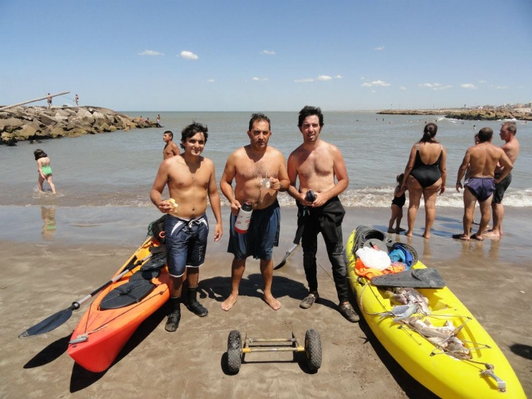 les cuento que dias anteriores bajaba el k1 por una bajada recomoda de lanchas en el balneario del cabo en mdq donde tmb alquilAban SOT pero el unico kayakfishing era el mio   que a mi parecer despertaba mucha curiosidad de los demas remadores y como era de esperarse hize un amigo (German) con un K.FREE de capital  que se copo con la onda PEK y masomenos lo equipo con una caña cuchillo y ancla y nos metimos 400mts, nos visito un lobo marino, hasta el crucero anamora cambio su curso por nosotros pero la zona no es de buena pesca solo saque una corvina 1500gms en 2 hs ese dia tambien lo invite a SantaClara y fuimos TMB con CharlyPiojoso del foro que estaba aca en mdq. Estando en SantaClara a las 8hs Salimos con Emi, Peje,Charly, y german.