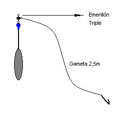 Esta linea la usas con el esmerillon triple de la foto es la mas facil y rapida de armar y manejar dentro del kayak, el ojal de arriba del esmerillon triple va a la tanza del reel directamente. la brazolada correji la medida qie indica la foto y hacela de 80 cm.