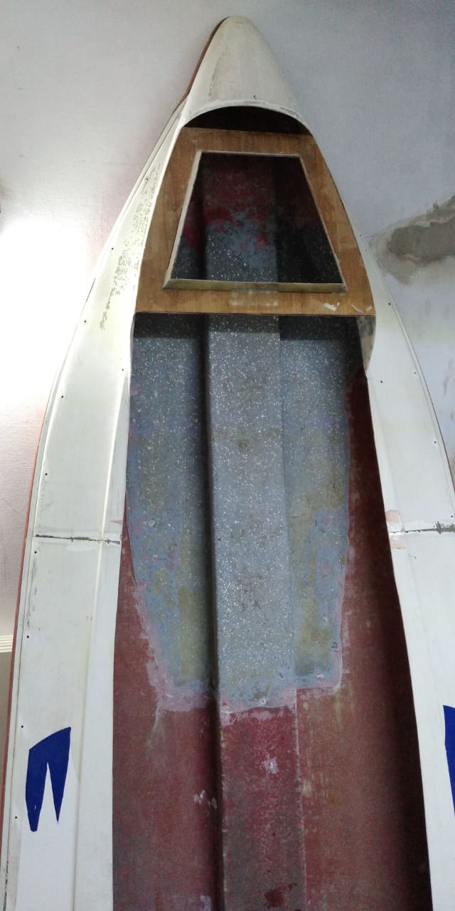 Arranque cortando la parte superior ,dejando parte de la trompa para hacer espacio para un tambucho ,y que mejore la flotabilidad de esta,al encarar olas .
