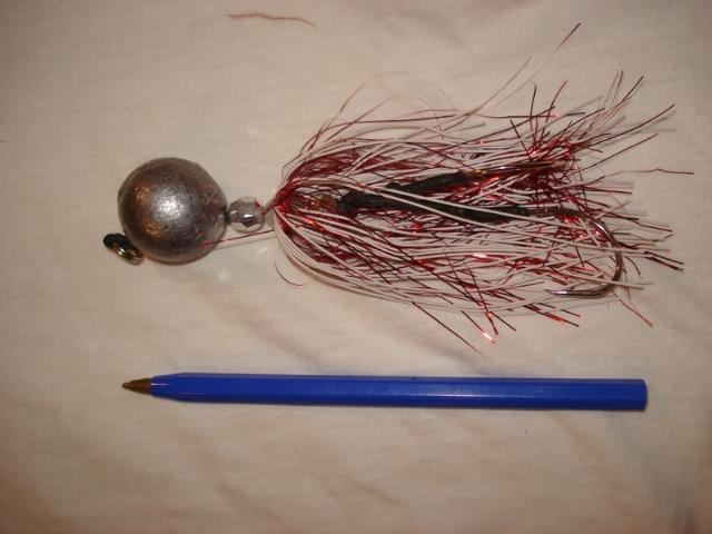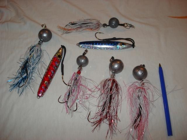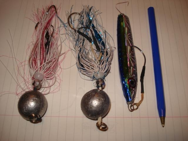Aca estan las fotos de los jigg utilizados. Si prestan atencion los articulados tienen dos tamaños de bolitas, unos son de 75 grs y los otros de 125 grs, los palitos son de 150 grs.