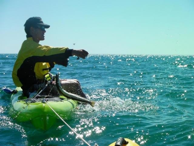 MATIAS "LUCHANDO CON UN PEZ PALO QUE SE HACE ALGO DIFICIL DE DOMINAR DESDE EL KAYAK POR SU FUERZA.