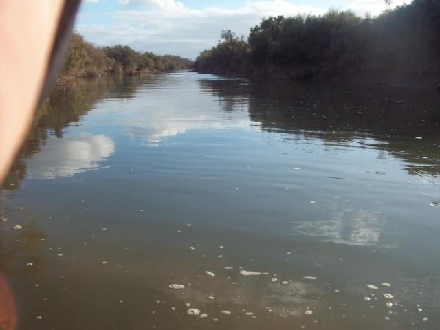 Parti de regreso corriente en contra el domingo a las 15:30 con la marea todavia bajando, el poco caudal hizo que los "pequeños saltos" se hicieran dificil de pasar, mas de una ves tuve que bajarme y vadear. Casi saliendo del riacho principal no me quise bajar del kay e intente cruzar un "rapido" no muy profundo, le di y le di pero no avanzaba, en un punto me vencio y para atras, con la mala suerte que el kayak pego en una piedra que me pone de costado y al agua! que broncaaaa!