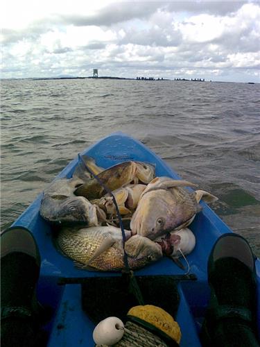 Hola les cuento que con la de hoy llevo 3 salidas de pesca en kayak que no fallan. Pique abundante y de muy buen tamaño de Corvinas Blancas. Een la foto la mas grande que se ve en la balanza acusó unos sorprendentes 4.4kg.