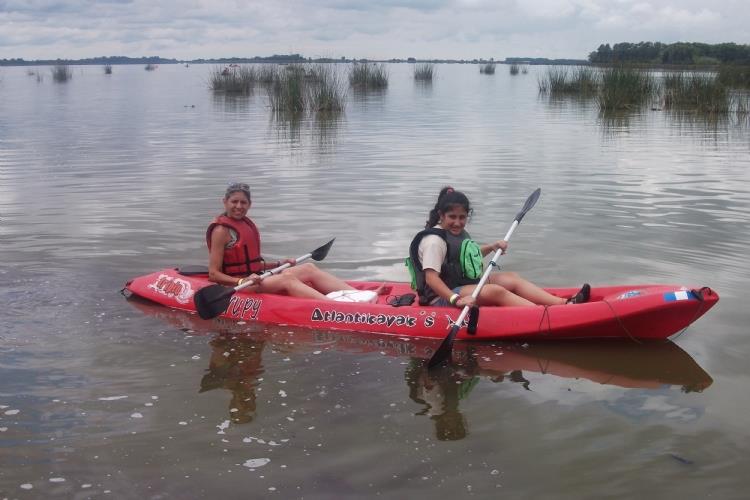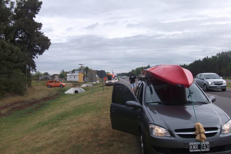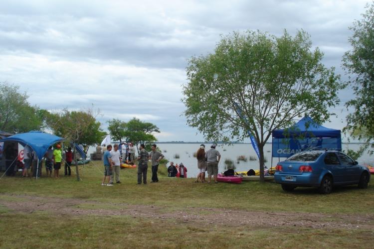El día arrancó con mal tiempo lo que nos hizo dudar sobre si se iba a realizar el evento ,pero la consigna era: no se suspende por mal tiempo. Al llegar al camping nos encontramos con algunos compañeros y sus familias que habían acampado el día anterior. Luego de los saludos bajamos los kayak de los autos a pesar de que lloviznaba de a ratos, y al agua, probamos distintos kayaks (gracias Palmito y Hoffa), remamos, le hicimos algunos tiritos a las tarus sin ningun resultado.