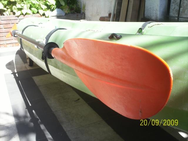 En caso de querer llevar la cania acostada, para evitar que se parta en un vuelco, como se supone que uno esta utilizando el remo, ya que esta saliendo del mar, quiere decir que el mismo entonces no estara colocado en el soporte, por ello levantando el extremo de la cinta, se puede aprisionar la cania en la parte superior de la banda, mediante el velcro que posee la misma.
