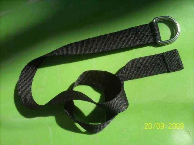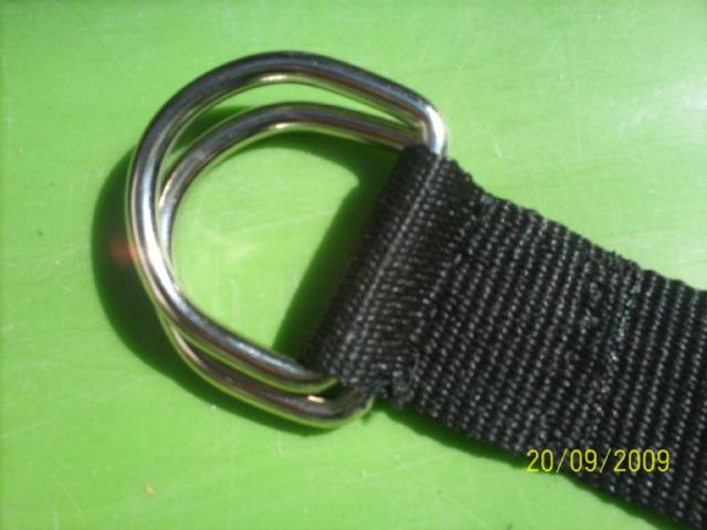 Luego se procede a ubicar 1 juego de Argollas, en uno de los extremos, se dobla la cinta permitiendo un solape amplio y previo a coserla por todos los bordes, tambien se refuerza la union pegandola con Poxiran.