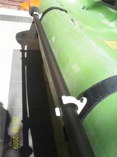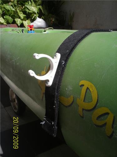 Una vez realizada esta tarea solo resta ubicar la posicion correcta de los soportes del remo, para ello conviene volver a armar el conjunto y presentar el remo, para marcar el lugar de la fijacion, la cual se realiza perforando un agujero mediante un clavo caliente a la cinta mochilera. Prestar atencion a esta operacion, porque el calor del clavo agranda rapidamente el agujero que se esta practicando, por lo tanto hay que tomar el clavo con una pinza y realizar la perforacion muy rapidamente y alejarlo ni bien el trabajo este concluido.