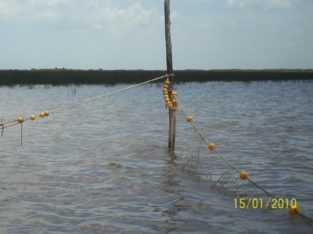 En esta oportunidad se decidio ingresar a la zona por un nuevo derrotero, mucho mas al Este de los hasta ahora conocidos, razon por la cual, los kilometros remados en esta oportunidad superan holgadamente a los realizados la semana anterior, Neo ya colocara el dato que fue registrado en su Gps...las condiciones del rio y climatologicas eran inmejorables. Llegados a la zona a relevar, comenzamos buscando a las preciadas tarus, en las zonas cercanas a los juncos, pero aun persistia mucha agua en el lugar, y las tarus permanecian escondidas entre los juncales faltando a la cita sin aviso, en eso continuamos paleando para desplazarnos mas hacia el Norte y aparece ante nuestros ojos la primera nota discordante de la jornada, un trasmallo gigantesco, ya que debia medir unos 100 mts facilmente, el cual no poseia capturas hasta el momento,....no obstante REPUDIAMOS  este tipo de pesca que destruye el ecosistema y debilita a las especies.
