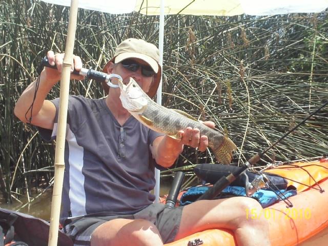 Dejamos atras este motivo que nos genera mal sabor y continuamos la travesia, siempre con la esperanza de volver a dar con nuevos ejemplares de Hoplias Malabaricus....cuando imprevistamente se produce un hecho que por un lado me sorprendio al no esperarlo, y en segundo termino nos dejo apabullados a todos por lo insolito del mismo.....ibamos remando en no mas de 40 cms de agua, a unos 20 mts de los juncales caracteristicos, cuando clavo la pala en el agua, de babor, emerge intempestivamente de la misma, una boga que estimo tendria unos 2 kgs de peso, y saltando literalmente mi kayak, de babor a estribor, pasa a 10 cms de mis rodillas, que en ese momento iban flexionadas, y vuelve a caer pesadamente al agua, generando un ruido como un chapuzon, e ingresar finalmente al agua para desaparecer a gran velocidad natatoria...jeje
