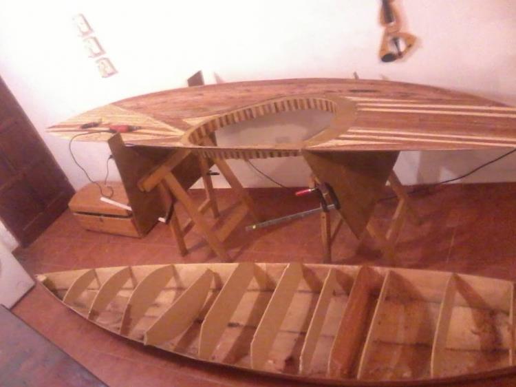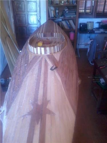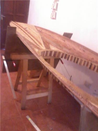 No, no es un respaldo, estoy haciendo el espaciador sobre el cual se pega el aro, estaban recien encoladas, como son maderas chuquitas me va a llevar un tiempo cerrar todo el aro, las maderitas son de media pulgada y despues se las recorta para q el aro vaya pcoarriba con epoxi. Falta lijar del lado de adentro y laminar las telas de vidrio. Despues pegar el casco y la cubierta y por ultimo va el tambucho