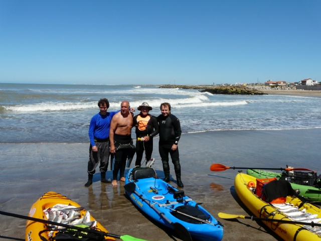 Pequeño informe de la salida: el sabado entrenamiento de remo en la albufera con Pantola, Juanchus y el inefable Papariki, un capo, la marea en bajante, poca agua, igual remamos bastante, un lugar hermoso, a la salida mate, y una tortitas hechas por papariki que estaban buenisimas, si el tipo tambien cocina. La cita era el domingo en el balneario summer de Santa Clara el domingo 9hs. LLegue estaba Pantola enseguida cayo Ariel Costa con su espectacular kayak y al rato papariki ya estaba analizando las olas, mientras caia el resto, Duvi, Feropla, Carugati, Jorge, y no se si me olvido de alguien, nos fuimos metiendo-Papariki marco el camino, siguio Arie y yo atras, impecable la entrada esquibando la rompiente. Anclamos a no se cuentos metros, llego Pantola, anclo cerca mio, empezo la pesca, por mi parte toda pescadilla de buen tamaño, creo que solo Duvi saco un par de corvinas y un congrio, Carugati saco un pez elefante, el mar estaba movidito pero soportable, por lo menos para mi, otros dejaron lindos recuerdos en el mar. Despues de casi tres horas, salio primero Ariel, con la malisiosa intension de escracharnos en la salida, y cuando vi que Papariki arranco, saque sin problemas el ancla y arranque detras del maestro, para una salida casi impecable, me cai bajando del kayak a un metro de la costa, solo para darle el gusto a Ariel. Todos salimos bien salvo juanchus que se le ocurrió salir por la escollera, por suerte sin problemas. Lo que siguio fue, mate, almuerzo y mas mate, con un dia hermoso en la playa como hasta las 5 de la tarde. Impresionante las familias de todos haciendo el aguante, y sobre todo la mujer de papariki, una idola Mary. Lunes dia libre, en mi caso volvi a marchi a remar con mi hijo- Van unas fotos.