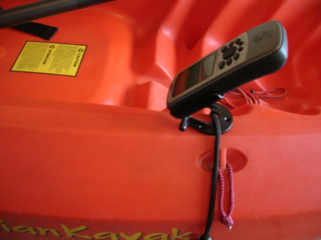 Cabo elástico pasado por el imbornal, conectado al soporte del gps y ajustado con un gancho mordaza Texilo, a su vez el gps tiene una correíta a la que le agregué un mosquetón y lo engancho a uno de los anclajes del Bravo por si las moscas!. Muy simple, pero anduvo 10 ptos... En esta foto está de prueba sin la correíta.