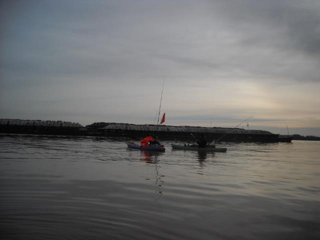 El viernes nos sorprendieron gratamente la presencia de Eduardo, Tango, Curlysan y Mapoggi que vinieron temprano y compartimos una jornada de pesca. Ahí si ya éramos un grupo de pescaenkayak….No voy a decir que llenamos el río de kayak, porque es enorme, pero fue un lindo espectáculo 6 kayak en el agua. El día fue menos frio y menos ventoso que el jueves dando la posibilidad de navegar mas tranquilos por estar bastante planchado. Pero es muy complicada la situación para pescar, porque garetear con tanta corriente no se puede, porque en un minuto estas lejísimos, ancla de capa, tampoco porque el viento venia del mismo lugar que la corriente, un muerto imposible por la profundidad, anclado se te iba la línea en un minuto, en mi caso tire de fondo y saque algunos bagres…zapatero nunca…